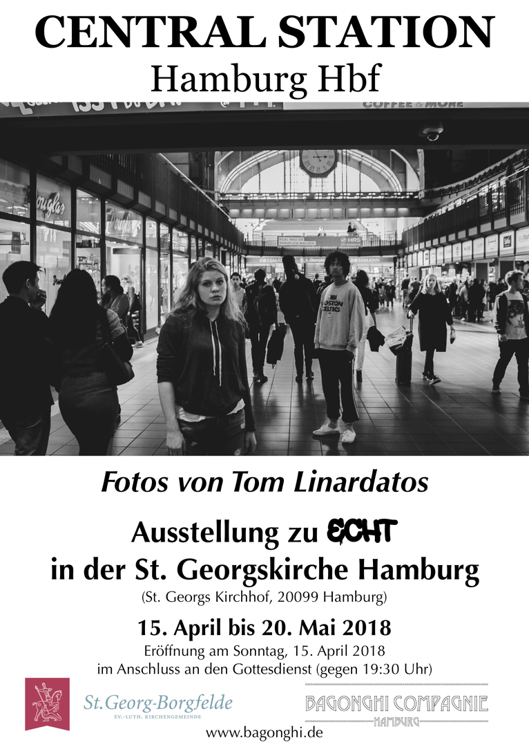 "Central Station - Hamburg Hbf" - so heißt die Ausstellung mit den Fotos von Tom Linardatos, die vom 15. April bis 20. Mai 2018 in der St. Georgskirche Hamburg gezeigt wird. Die Fotoaufnahmen sind im Rahmen der Theaterproduktion "ECHT" nach dem gleichnamigen Jugendroman von Christoph Scheuring entstanden, der die Geschichte von Straßenkindern in und rund um den Hamburger Hauptbahnhof thematisiert.