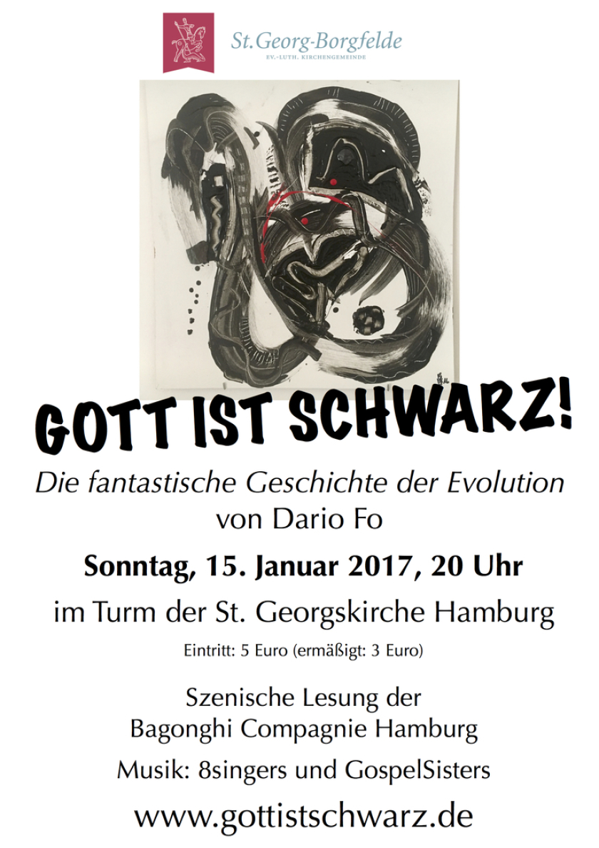 „Dio è nero!“ - „Gott ist schwarz!“, der letzte große Theatertext von Dario Fo, der im Oktober 2016 im Alter von 90 Jahren starb, ist als Auseinandersetzung mit einer Gruppe religiöser Fundamentalisten entstanden, die das Mailänder Naturkunde-Museum vor einigen Jahren mit Steinen gegen Fenster und Fassaden attackiert hatten, um gegen Darwins Evolutionstheorie zu protestieren. Aus Solidarität mit diesem prominenten Haus, einem der wichtigsten italienischen Museen, stellte Dario Fo im Februar 2011 - direkt im Museum - seinen Text „Gott ist schwarz!“ vor, in dem er die Form eines antiken Streitgesprächs imitiert. Darin streiten der kindlich-naive „Simplicio“ und ein allwissender Gelehrter um die Frage, wie der Mensch entstanden ist, und ob religiöse Betrachtung und wissenschaftliches Denken sich ergänzen oder widersprechen. "Gott ist schwarz!" ist eine Perle satirisch-bissiger Sprach- und Sprechkunst.