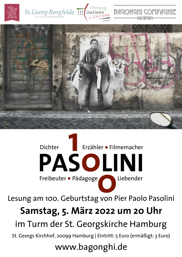 In una lettura pubblica nel giorno del centesimo compleanno di Pasolini, il 5 marzo 2022 - in collaborazione con Giovanni Zocco e l'Istituto Italiano di Cultura - la Bagonghi Compagnie di Amburgo presenta alcune delle più belle poesie e dei piú bei racconti del profetico eretico e tenero amante.