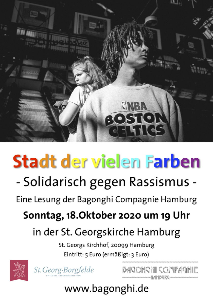 In einer Lesung in der St. Georgskirche - in unmittelbarer Nähe des Hauptbahnhofs - stellt die Bagonghi Compagnie Hamburg einige der wichtigen alten und neuen Texte von Frauen und Männern vor, die sich in Wort und Tat für die Gleichbehandlung aller Menschen einsetzen und eingesetzt haben.